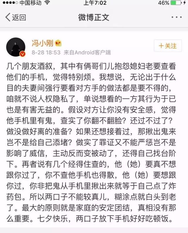 最近一次让这个话题成为热搜的,是七夕节当天,冯小刚发了条微博劝女人别查伴侣手机。